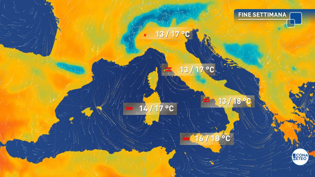Temperature: minime in ulteriore aumento al Nord. Massime per lo più in lieve rialzo sul Sud peninsulare, in lieve calo al Nord, sul medio Tirreno e in Sardegna; valori in generale sotto le medie stagionali.