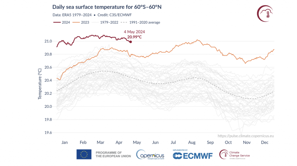 La temperatura media globale della superficie del mare (SST) per il mese di aprile 2024 su 60°S-60°N è stata di 21,04°C, il valore più alto mai registrato per il mese, marginalmente inferiore ai 21,07°C registrati per marzo 2024.