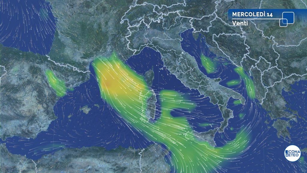 Questa situazione sarà caratterizzata anche da un rinforzo dei venti in prevalenza dai quadranti meridionali eccetto sulla Sardegna dove invece rinforzerà il Maestrale.