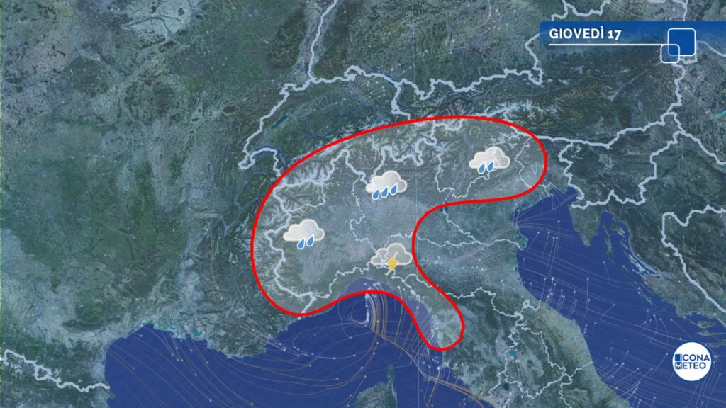 Sulle regioni di Piemonte e Valle d’Aosta sono attese nevicate fino a 600-800 metri, mentre in Lombardia la neve cadrà oltre i 1000 metri. Le piogge saranno più isolate ma possibili su Emilia, Toscana, Lazio, nord Campania, Calabria e Sardegna. In serata potranno svilupparsi rovesci o temporali tra basso Lazio e Campania settentrionale, specie lungo il versante tirrenico.