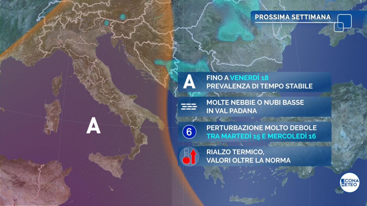 Un debole campo di alta pressione sarà protagonista sull’Italia almeno per tutta la prima parte della prossima settimana. Dunque tempo più stabile, con clima mite e valori oltre la norma, e nebbie in aumento al Centro-Nord. Martedì una debolissima perturbazione si avvicinerà ai settori di Nord-Ovest del nostro Paese, senza però portare piogge di rilievo.