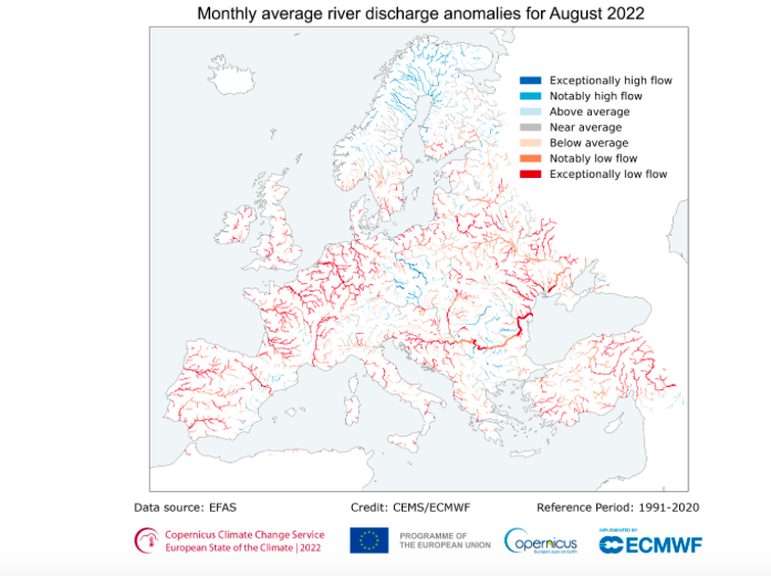 L’anomalia annuale dell’umidità del suolo è stata la seconda più bassa degli ultimi 50 anni, con solo aree isolate che hanno visto condizioni di umidità del suolo superiori alla media. Inoltre, il flusso fluviale per l’Europa è stato il secondo più basso mai registrato, segnando il sesto anno consecutivo con flussi inferiori alla media. In termini di area interessata, il 2022 è stato l’anno più secco mai registrato, con il 63% dei fiumi europei che ha visto portate inferiori alla media.