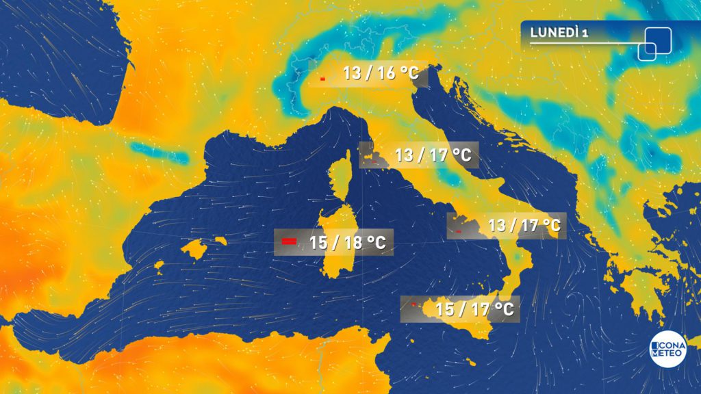 Temperature minime in sensibile calo al Nord e sulle regioni peninsulari, con valori localmente vicini allo zero all’alba sulle regioni settentrionali. Massime in rialzo al Nord e sul medio versante adriatico; stazionarie o in leggero calo altrove, generalmente comprese tra 14 e 20 gradi.