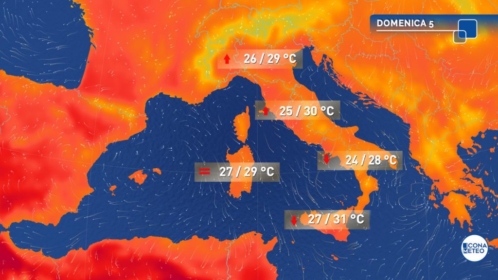 Temperature: minime in lieve calo su gran parte del Centro-Sud. Massime in leggera flessione all’estremo Sud; altrove variazioni locali e contenute, per lo più in rialzo. Caldo nella norma, con valori compresi tra 25 e 30 gradi, localmente superiori nel sud ed est della Sicilia.