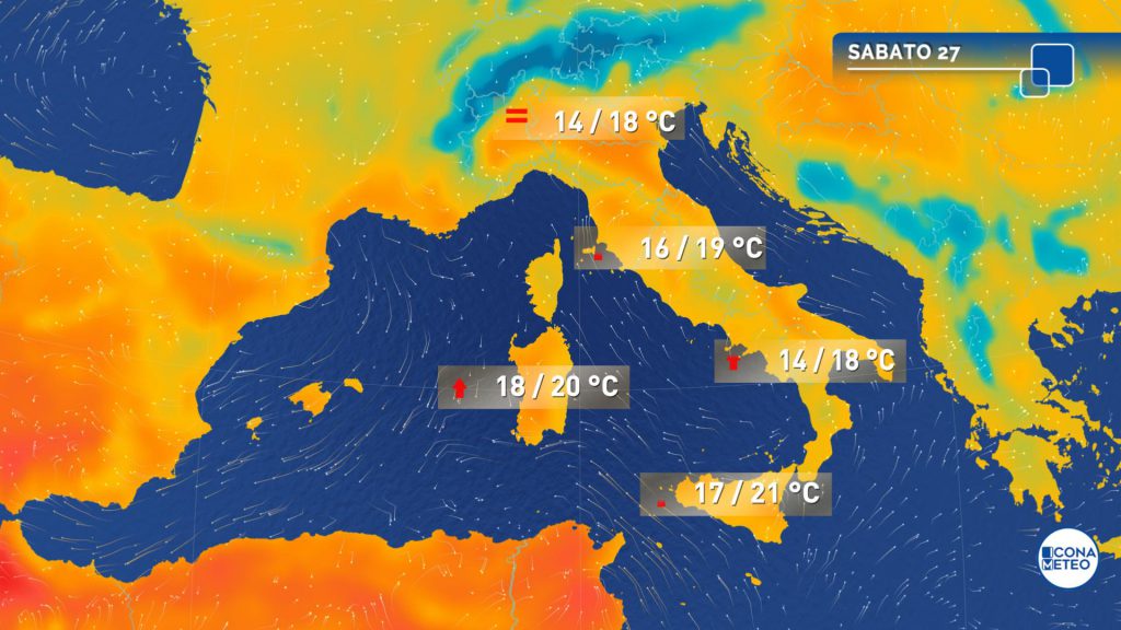 Temperature minime del mattino stazionarie o in lieve aumento. Temperature massime pomeridiane in lieve calo in Val Padana e Venezie, in lieve aumento invece su regioni tirreniche, Umbria e Sicilia. Nelle due Isole maggiori valori diffusamente intorno ai 20 °C, punte di 17-19 °C in Trentino Alto Adige, Emilia e al Centro-Sud.