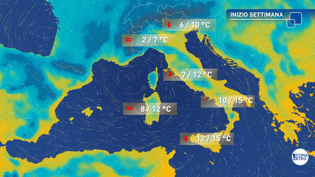 Temperature stazionarie o in leggero calo, con valori massimi localmente sotto la media al Centro-Sud.