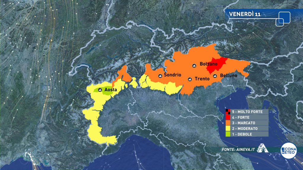 Sui settori alpini occidentali, sulle prealpi lombarde e sulle Orobie occidentali, invece, il pericolo valanghe risulta essere moderato, fino a debole in settori della Valle d’Aosta.