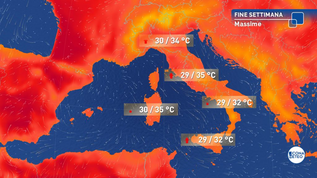 Le temperature risulteranno elevate e superiori alla norma soprattutto nelle regioni settentrionali e occidentali dove si potranno toccare i 33-34°C, ma con picchi di 35-36°C non esclusi , in particolare sulla Sardegna.