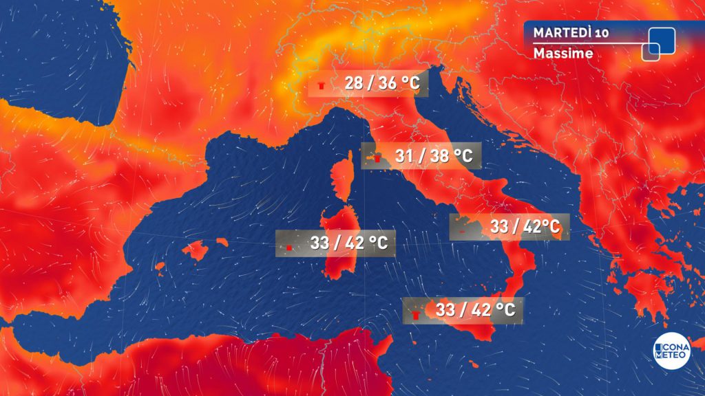 Temperature: in aumento quasi ovunque nei valori minimi; massime in rialzo al Centro Nord, su Calabria e Sicilia orientale. Giornata estremamente calda al Sud e sulle isole (massime anche superiori a 40 gradi, specialmente in Sicilia). Caldo e afa si intensificano anche al Nord.