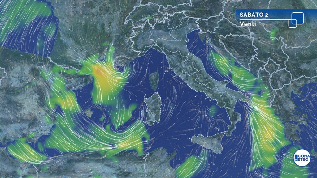 Ancora molto ventoso al Centro-Sud, sull’alto Adriatico e il Ligure, per venti in rotazione antiroraria attorno al centro depressionario posizionato sul Ligure.