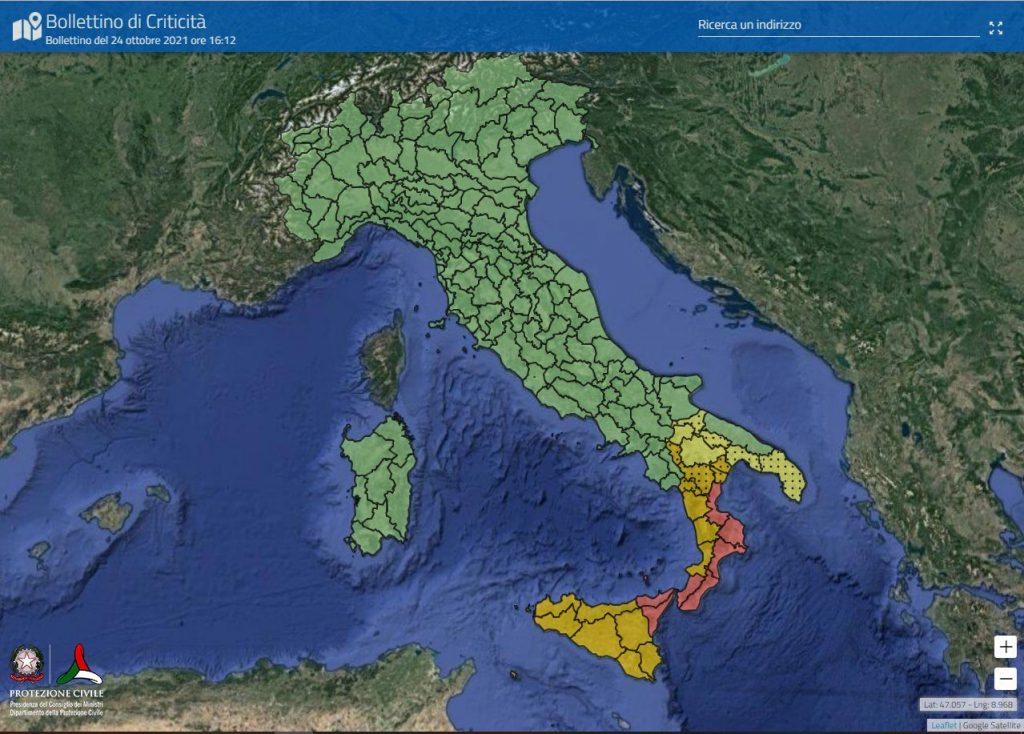 La Protezione Civile ha diramato la massima allerta per diversi settori di Calabria e Sicilia.