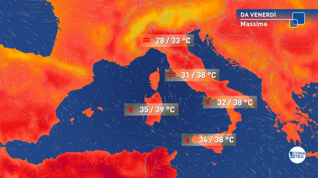 Temperature: in aumento al Sud e sulla Sicilia; in lieve calo sulle regioni centrali tirreniche; al Sud e sulle isole la giornata sarà estremamente calda con punte di 38-39°C.