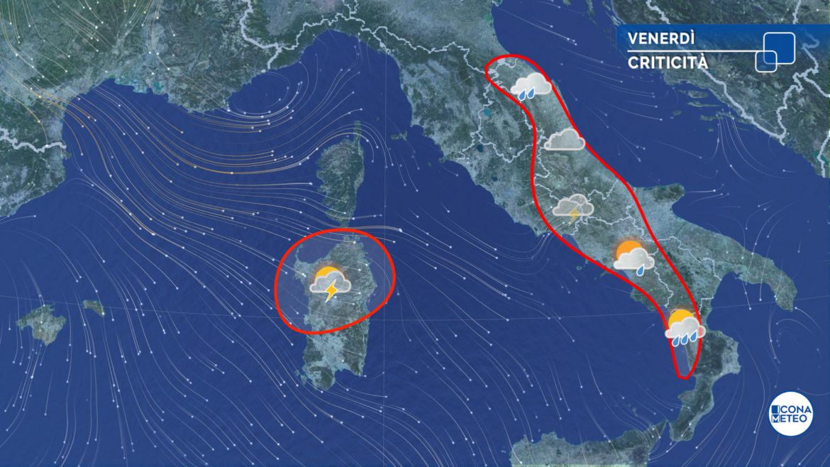 La perturbazione colpirà con più decisione il Centro-Sud, dove le piogge saranno diffuse e localmente anche intense, insistenti soprattutto sulle regioni centrali adriatiche e, dal pomeriggio, anche sul basso Tirreno e sulla Sardegna.