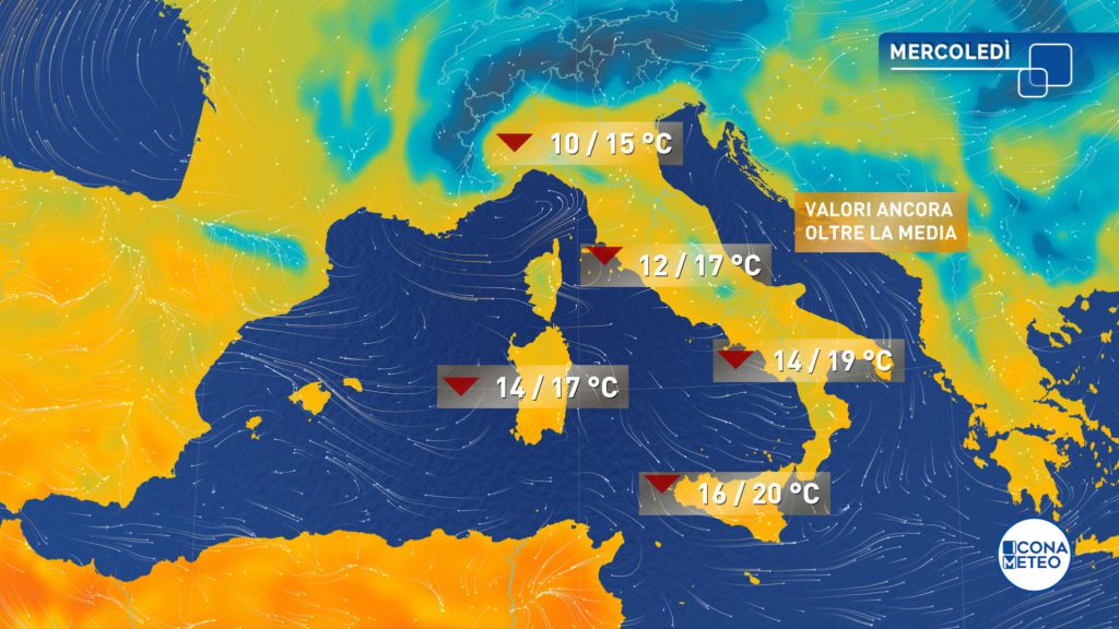 Le temperature non faranno ancora registrare variazioni rilevanti, al più in lieve calo al Nord-Est e in Sicilia; valori pomeridiani ancora sopra la media. Venti di Scirocco al Centro-Sud: da tesi a forti nel Canale di Sicilia e di Sardegna con mari molto mossi; deboli o localmente moderati altrove. Venti molto deboli al Nord.