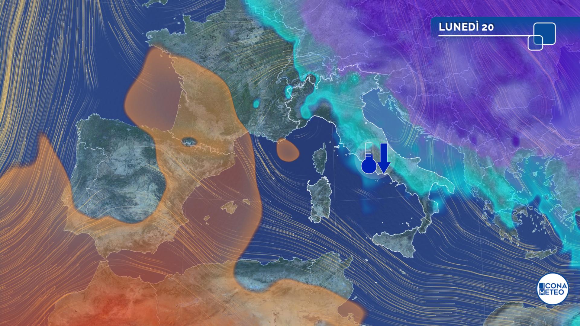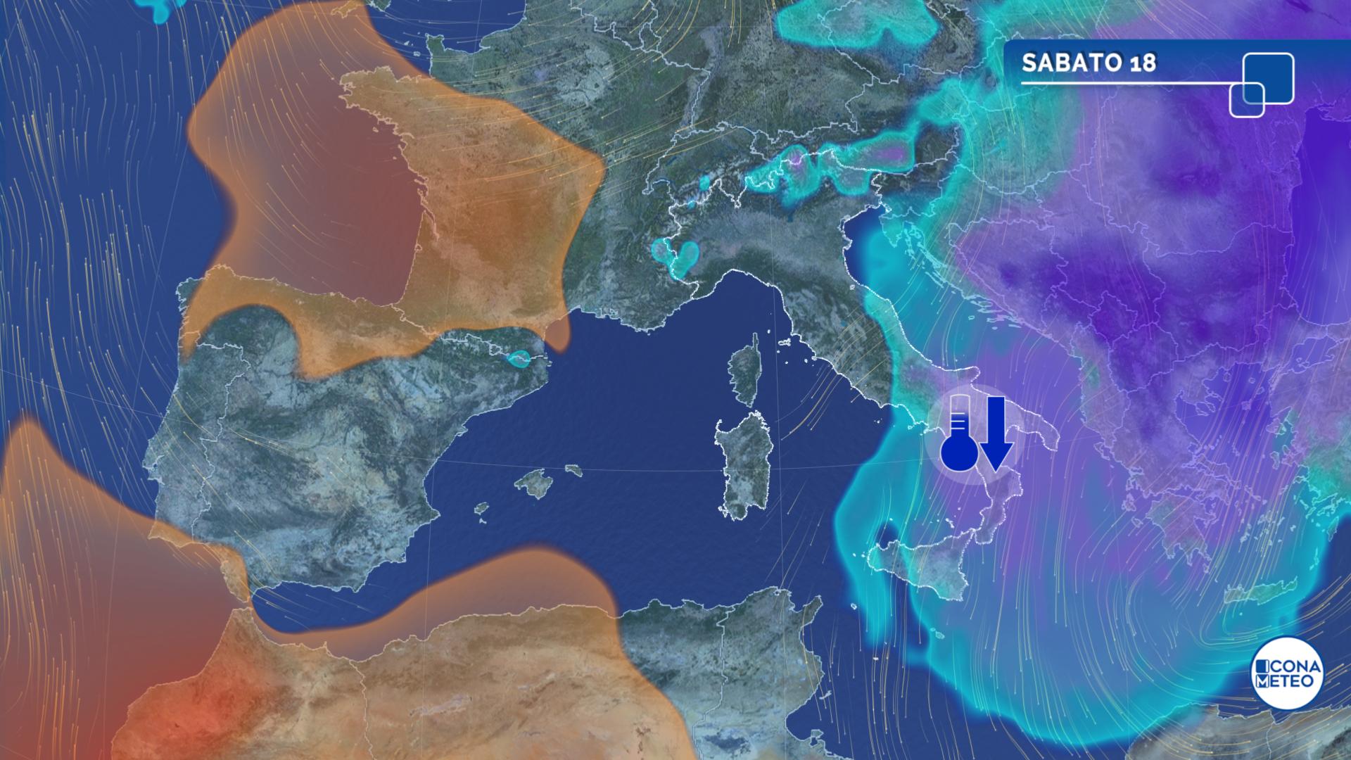 Gli intensi venti settentrionali che seguiranno il fronte saranno responsabili di un calo delle temperature, più sensibile al Sud e sulle regioni del versante adriatico.