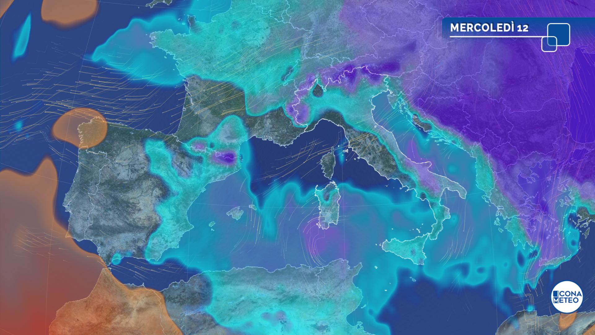 In particolare, mercoledì al Nord il tempo sarà prevalentemente soleggiato su Alpi e Prealpi; in pianura e sulla Liguria cieli grigi per strati bassi e nebbie, a tratti persistenti anche nelle ore centrali della giornata. Al Centro il cielo sarà nuvoloso o molto nuvoloso in Toscana, sull’Umbria e sul Lazio settentrionale, con possibili pioviggini sulla Toscana; tempo in prevalenza soleggiato sulle regioni adriatiche. Al Sud si prevede un cielo sereno o poco nuvoloso in Campania; da poco nuvoloso a irregolarmente nuvoloso sulle altre regioni, nell’ovest e nord della Sicilia. In Sardegna sarà presente nuvolosità bassa sul settore occidentale dell’isola.