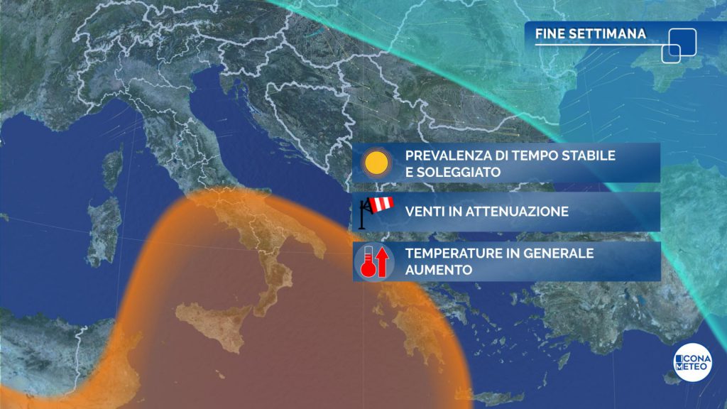 La tendenza per l’inizio della prossima settimana vede il ritorno dell’alta pressione, in espansione fino al Mediterraneo centrale, e una conseguente fase di generale stabilità atmosferica per tutto il Paese. Nel frattempo cesserà anche il flusso di aria fredda e le temperature tenderanno a risalire riportandosi su valori nella norma o anche al di sopra.