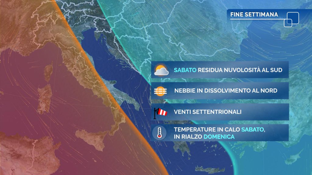 Allontanandosi rapidamente verso il Mare Egeo, nelle prime ore di sabato la perturbazione determinerà ancora qualche pioggia residua all’estremo Sud e in Sicilia. In seguito, la giornata trascorrerà ovunque senza piogge di rilievo e anche nelle pianure del Nord il sole tornerà ad avere la meglio con l’esaurirsi delle nebbie.