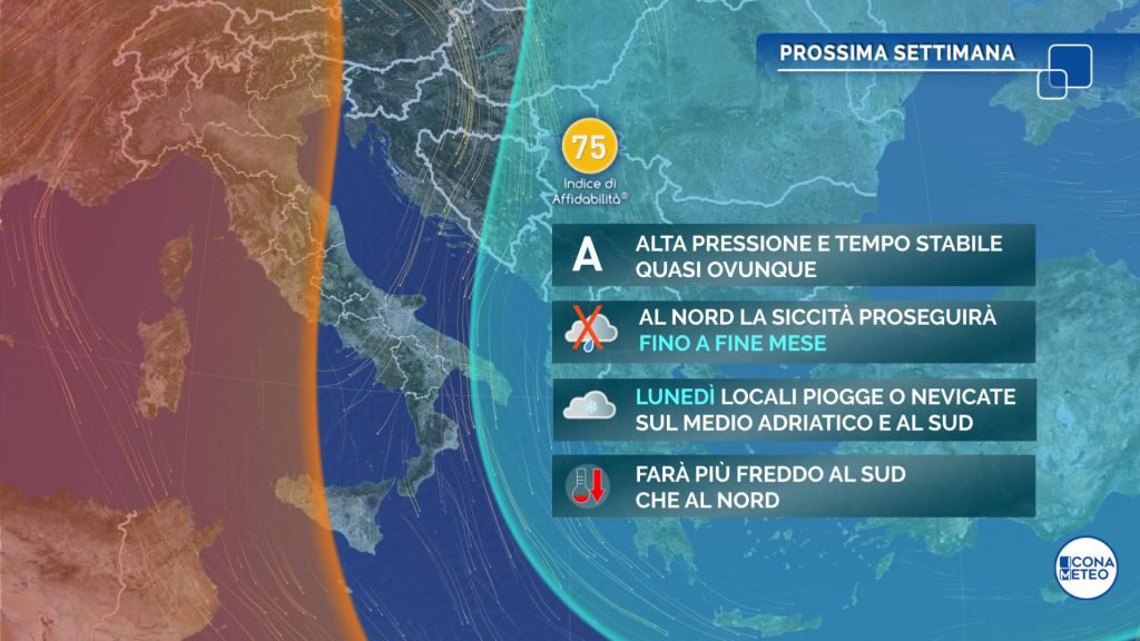 La settimana si è aperta oggi con l’Italia divisa in due dalle condizioni meteo, che vedono il Nord ancora sotto l’anticiclone e il Centro-Sud alle prese con una perturbazione. Dopo una fase più stabile ovunque che segnerà i prossimi giorni fino a giovedì, per l’ultima parte della settimana si profila uno scenario di nuovo simile: l’anticiclone manterrà infatti saldo il dominio sulle nostre regioni settentrionali, soffocate da una siccità che ha finora segnato praticamente tutta la stagione invernale, mentre una debole perturbazione attraverserà il Centro-Sud.