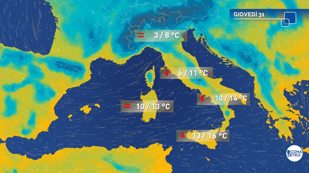 Quella di giovedì si preannuncia come una giornata con tempo più stabile e in miglioramento anche nelle regioni centro-meridionali. Qualche pioggia insisterà sulla Sardegna occidentale, sulle coste toscane e lungo il basso versante tirrenico. Nel resto d’Italia giornata soleggiata. Maggiore presenza di nuvole al mattino in Friuli Venezia Giulia e nelle zone interne del Centro. Nebbie a inizio giornata, localmente anche fitte, in Pianura Padana, sulle coste dell’alto Adriatico e nelle valli di Toscana e Umbria. In serata nuovo aumento della nuvolosità su estremo Nord-Ovest, Liguria e regioni centrali tirreniche. Piogge in Toscana e deboli nevicate sulle Alpi occidentali. Nella notte di San Silvestro la nuvolosità si estenderà a gran parte del Centro-Nord.